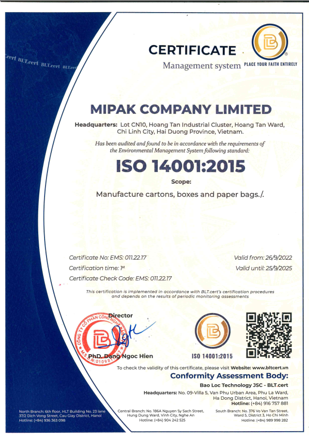 Tóm lại, việc áp dụng tiêu chuẩn ISO 14001 trong ngành bao bì carton không chỉ giúp bảo vệ môi trường mà còn nâng cao hiệu quả sản xuất và uy tín doanh nghiệp, thúc đẩy sự phát triển bền vững và đáp ứng mong đợi của thị trường hiện đại.